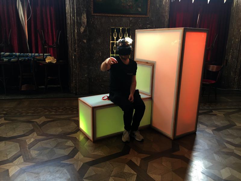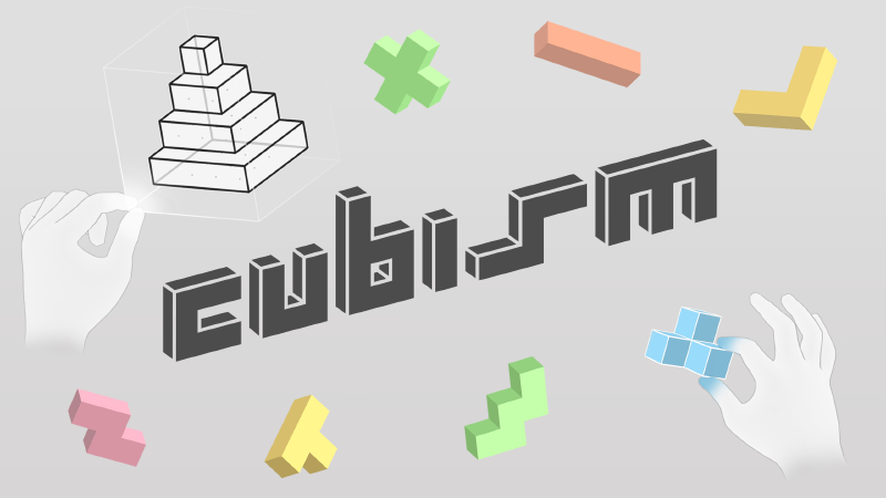 blurring reality and VR in this installation for the minimalist Cubism, a deceptively simple puzzle game in VR where you assemble increasingly complex shapes out of colored blocks